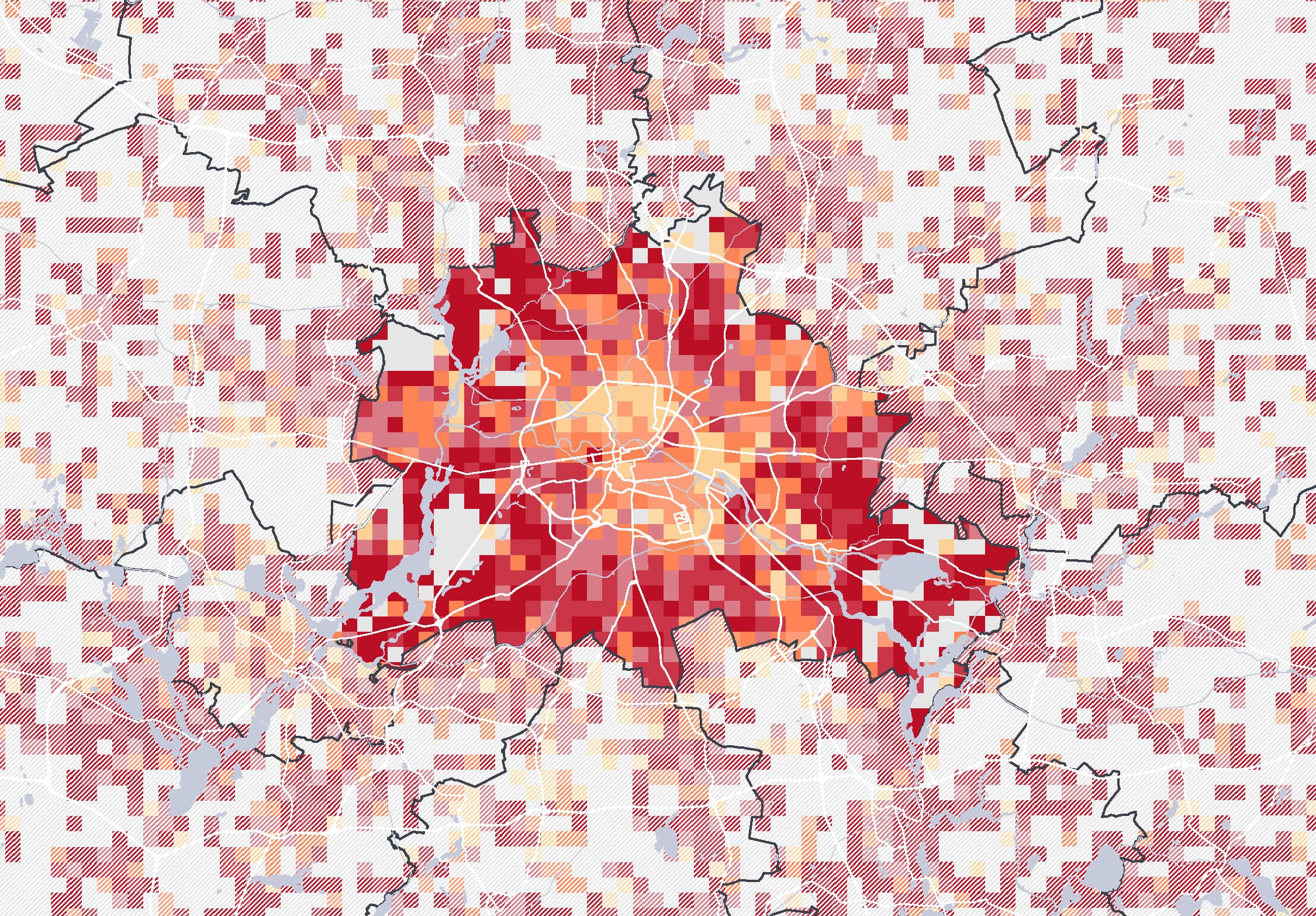 Ähnlich sieht es in vielen europäischen Großstädten aus, wie Wien, Kopenhagen, Amsterdam, Frankfurt oder München, deren Metropolregionen oft von Zersiedelung geprägt sind. Besonders dünn besiedelt ist das Berliner Umland: Eine Weltstadt mit der Bevölkerungsdichte des Dahme-Spreewald-Kreises wäre 7,6-mal so groß wie Europa.