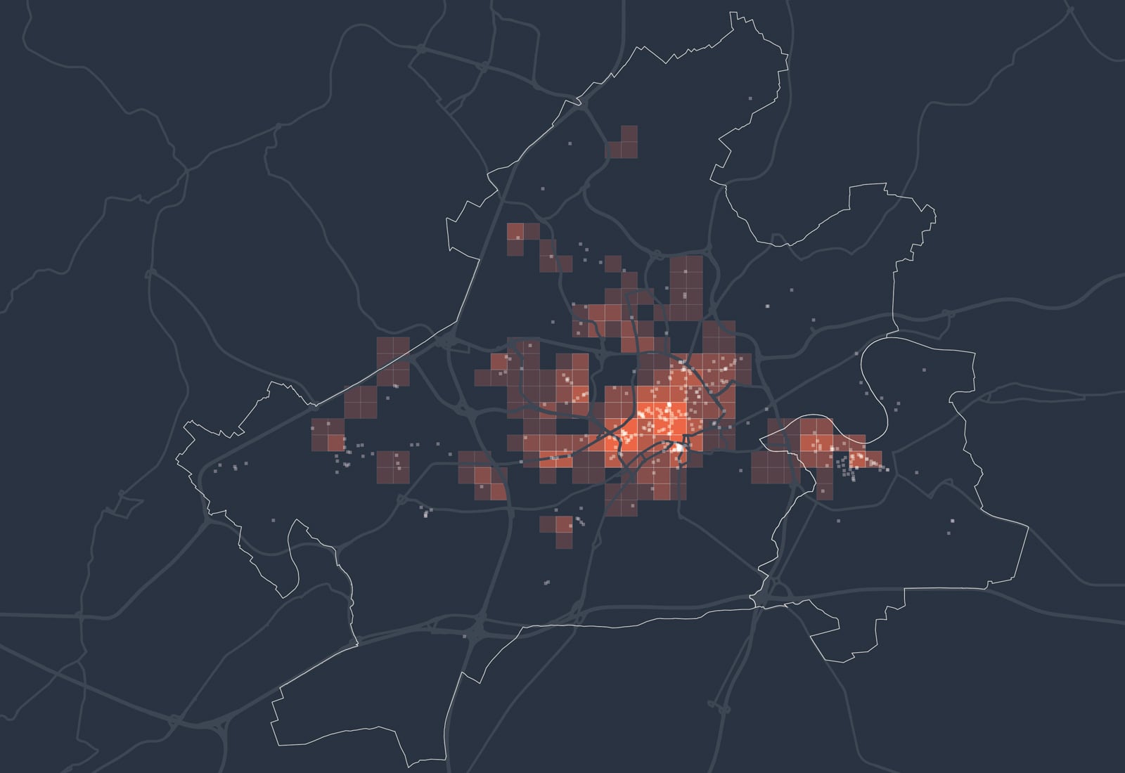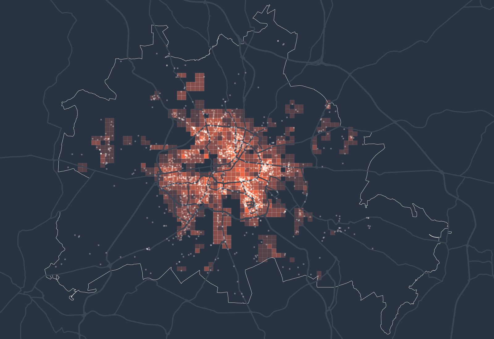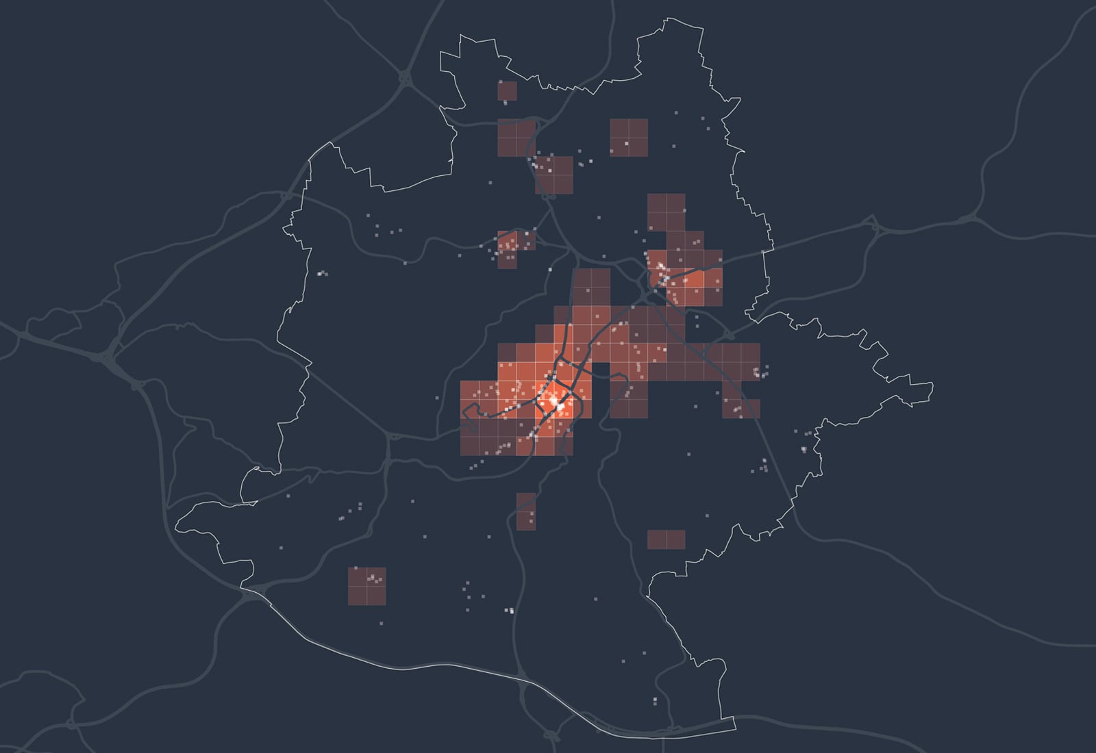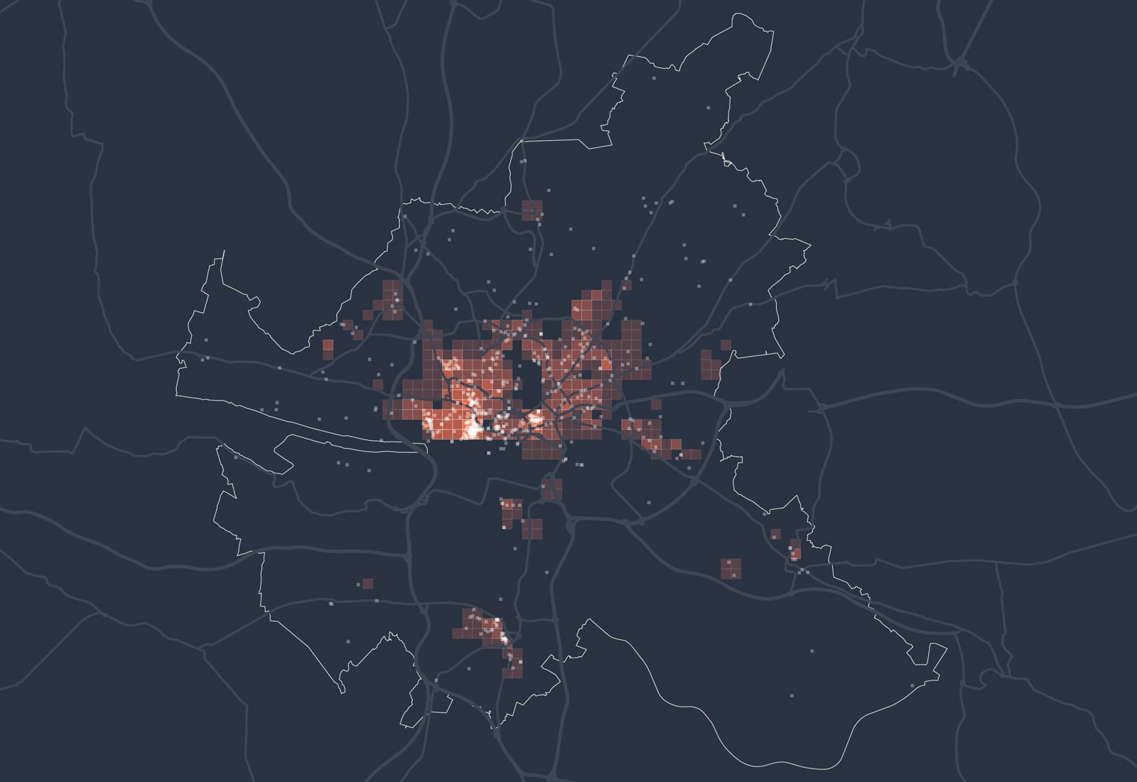 Kartenbeschreibung: Die Karte visualisiert die Gesamtsumme der Mobilfunkbewegungen im Jahr 2022 in den Nächten von Freitag auf Samstag zwischen 2 und 3 Uhr nachts. Dazu wurden anonymisierte und aggregierte Mobilfunkdaten aus dem Netz der Telefónica GmbH analysiert. Die gezeigten Gitterzellen (500x500 Meter) sind je nach Gesamtzahl der Mobilfunkgeräte, die sich im Betrachtungszeitraum mindestens 30 Minuten dort aufgehalten haben, eingefärbt. Zusätzlich sind Bars als weiße Punkte eingezeichnet.