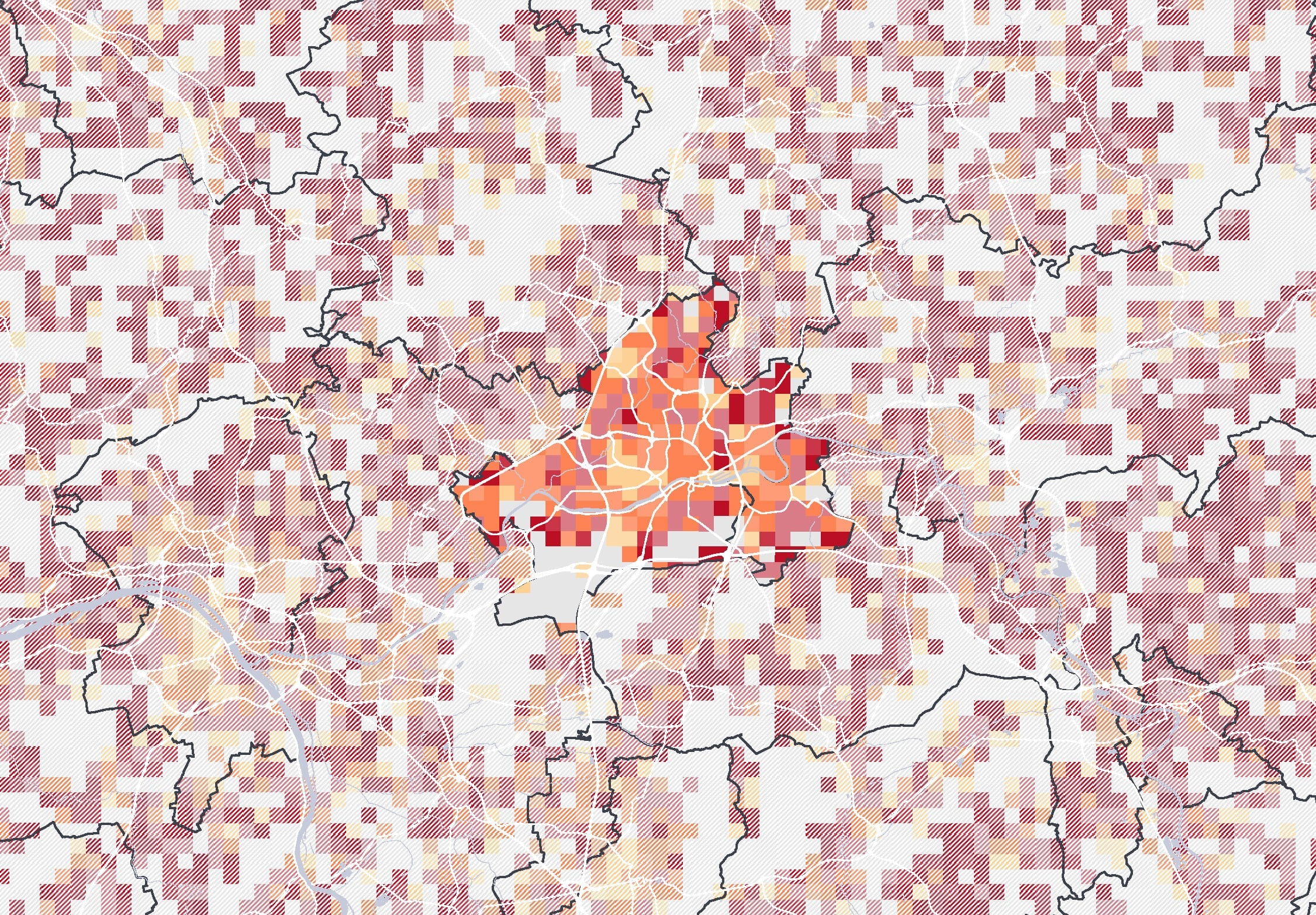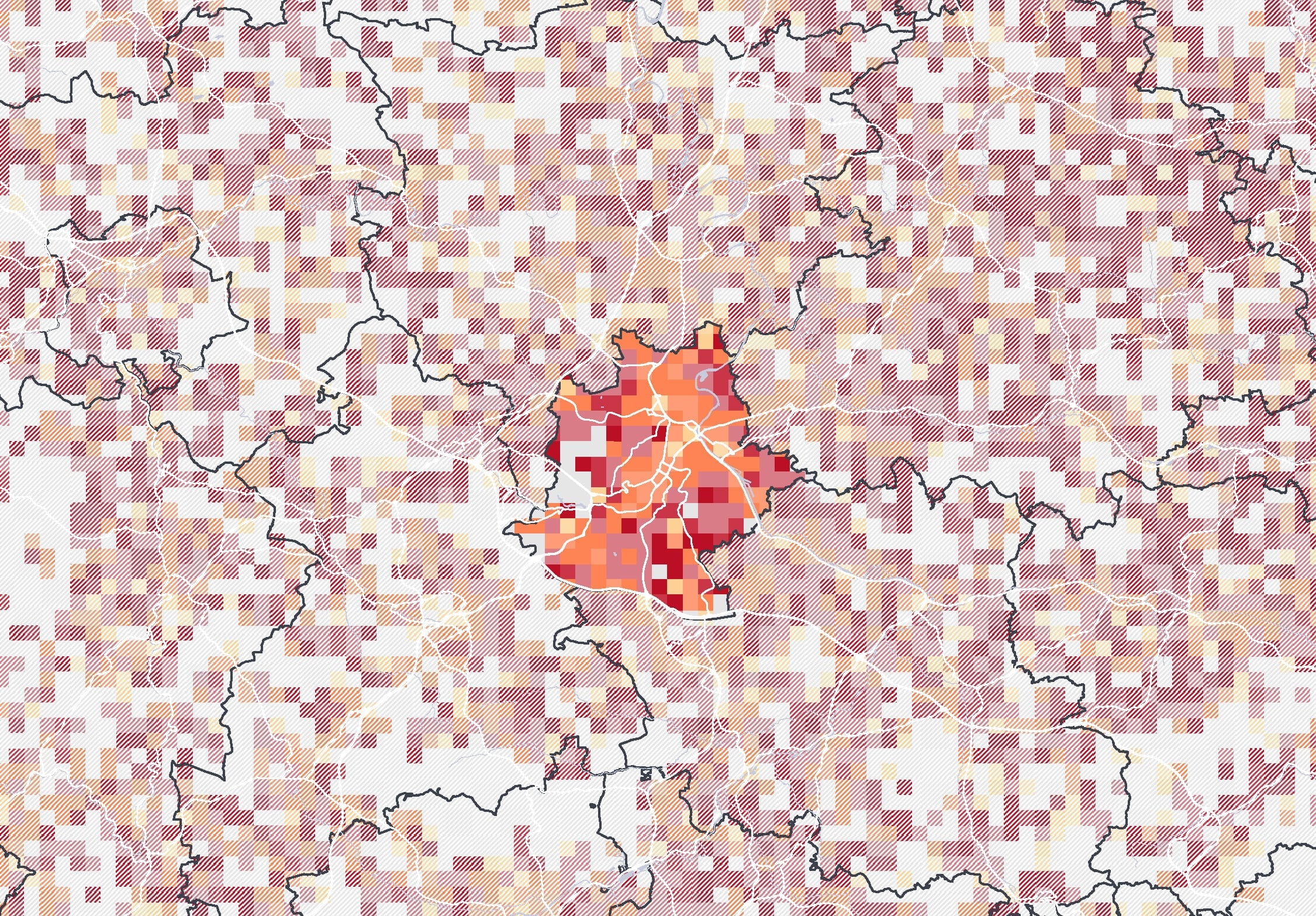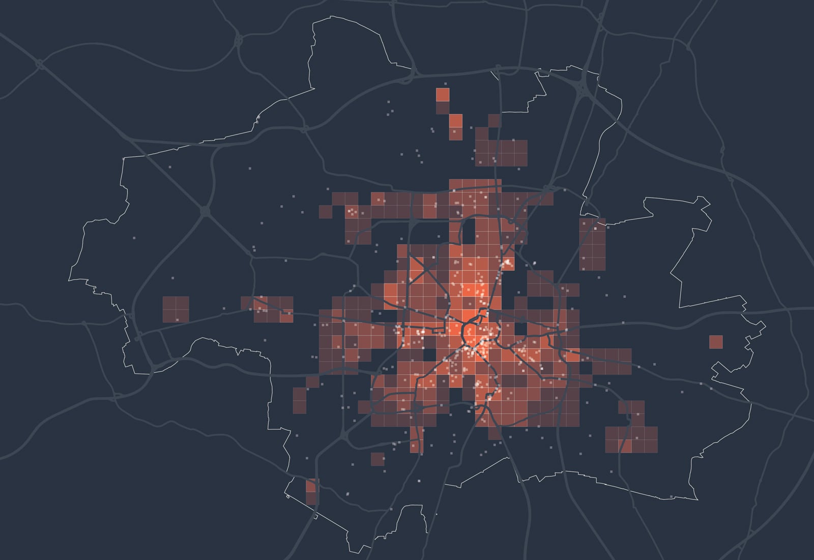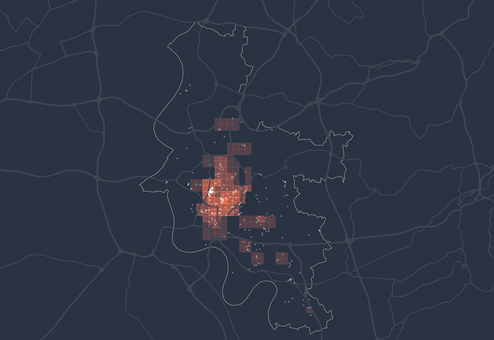 Kartenbeschreibung: Die Karte visualisiert die Gesamtsumme der Mobilfunkbewegungen im Jahr 2022 in den Nächten von Freitag auf Samstag zwischen 2 und 3 Uhr nachts. Dazu wurden anonymisierte und aggregierte Mobilfunkdaten aus dem Netz der Telefónica GmbH analysiert. Die gezeigten Gitterzellen (500x500 Meter) sind je nach Gesamtzahl der Mobilfunkgeräte, die sich im Betrachtungszeitraum mindestens 30 Minuten dort aufgehalten haben, eingefärbt. Zusätzlich sind Bars als weiße Punkte eingezeichnet.