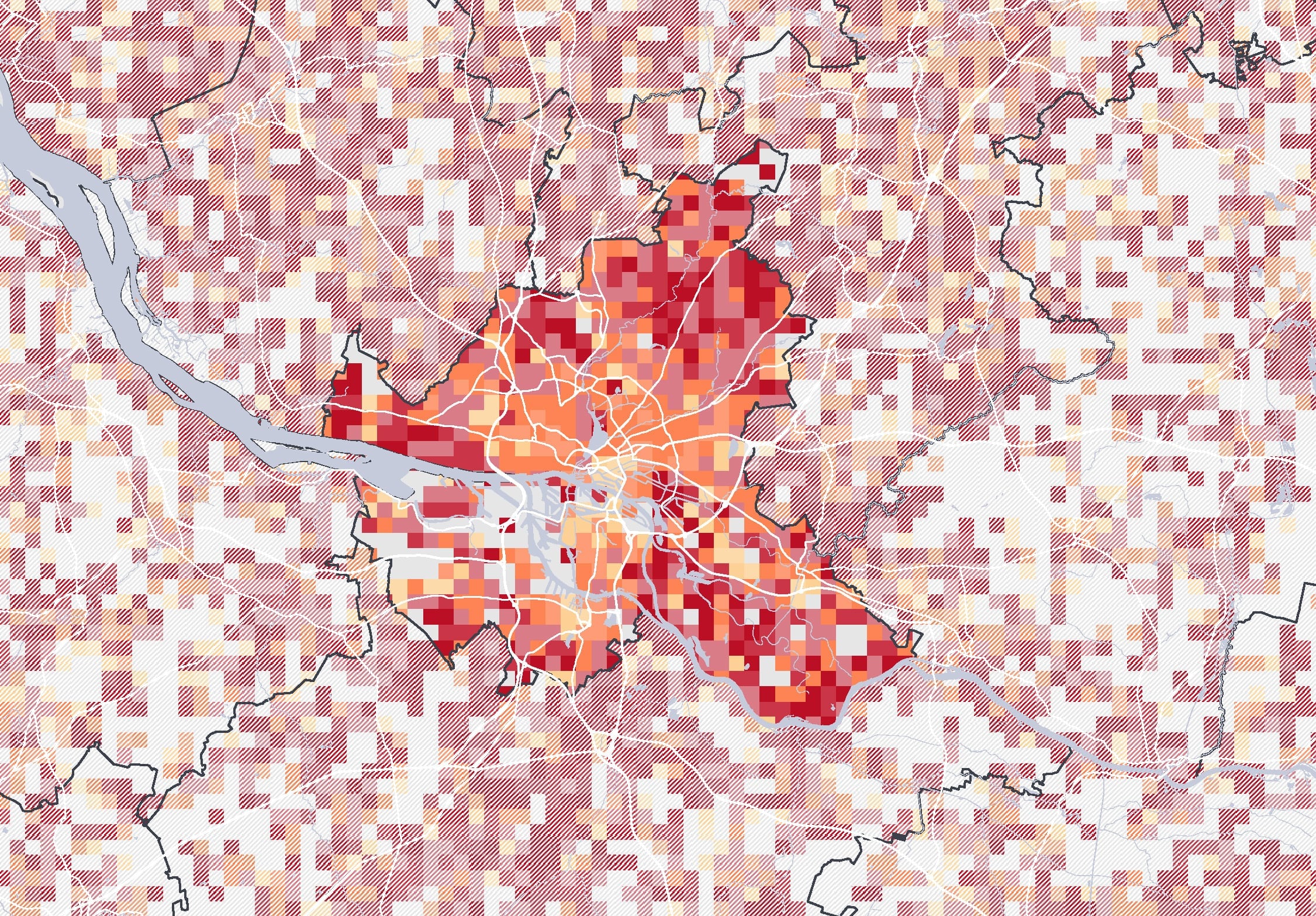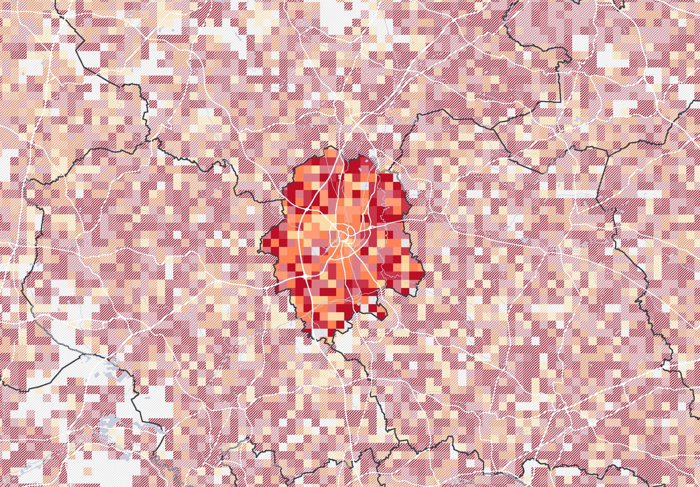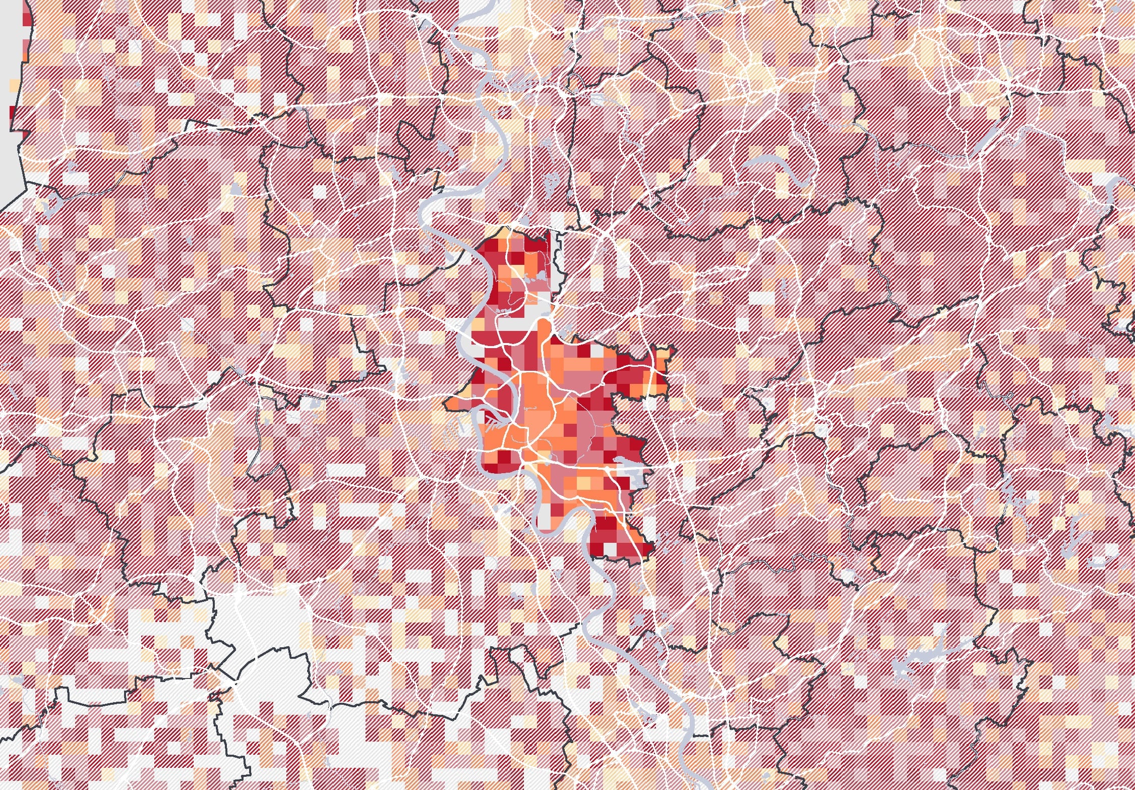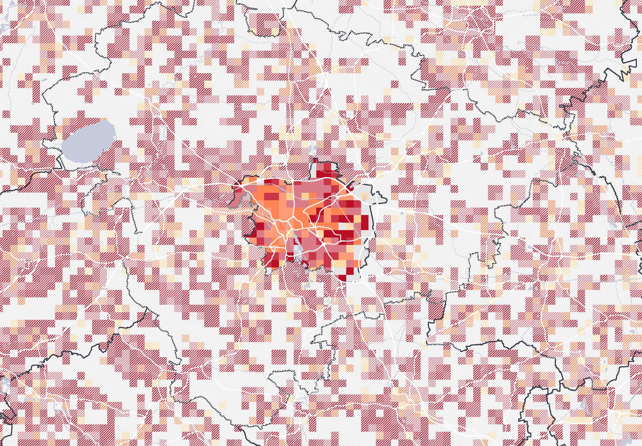 Kartenbeschreibung: Die Karte visualisiert die Gesamtsumme der Mobilfunkbewegungen im Jahr 2022 in den Nächten von Freitag auf Samstag zwischen 2 und 3 Uhr nachts. Dazu wurden anonymisierte und aggregierte Mobilfunkdaten aus dem Netz der Telefónica GmbH analysiert. Die gezeigten Gitterzellen (500x500 Meter) sind je nach Gesamtzahl der Mobilfunkgeräte, die sich im Betrachtungszeitraum mindestens 30 Minuten dort aufgehalten haben, eingefärbt. Zusätzlich sind Bars als weiße Punkte eingezeichnet.