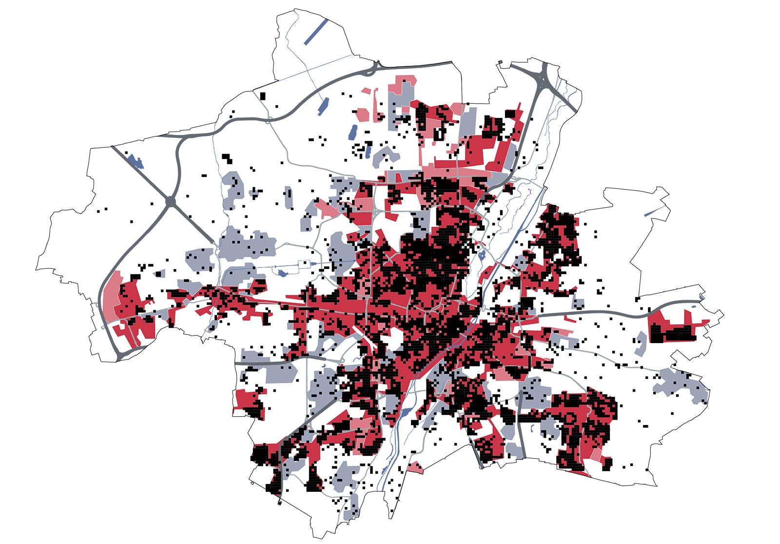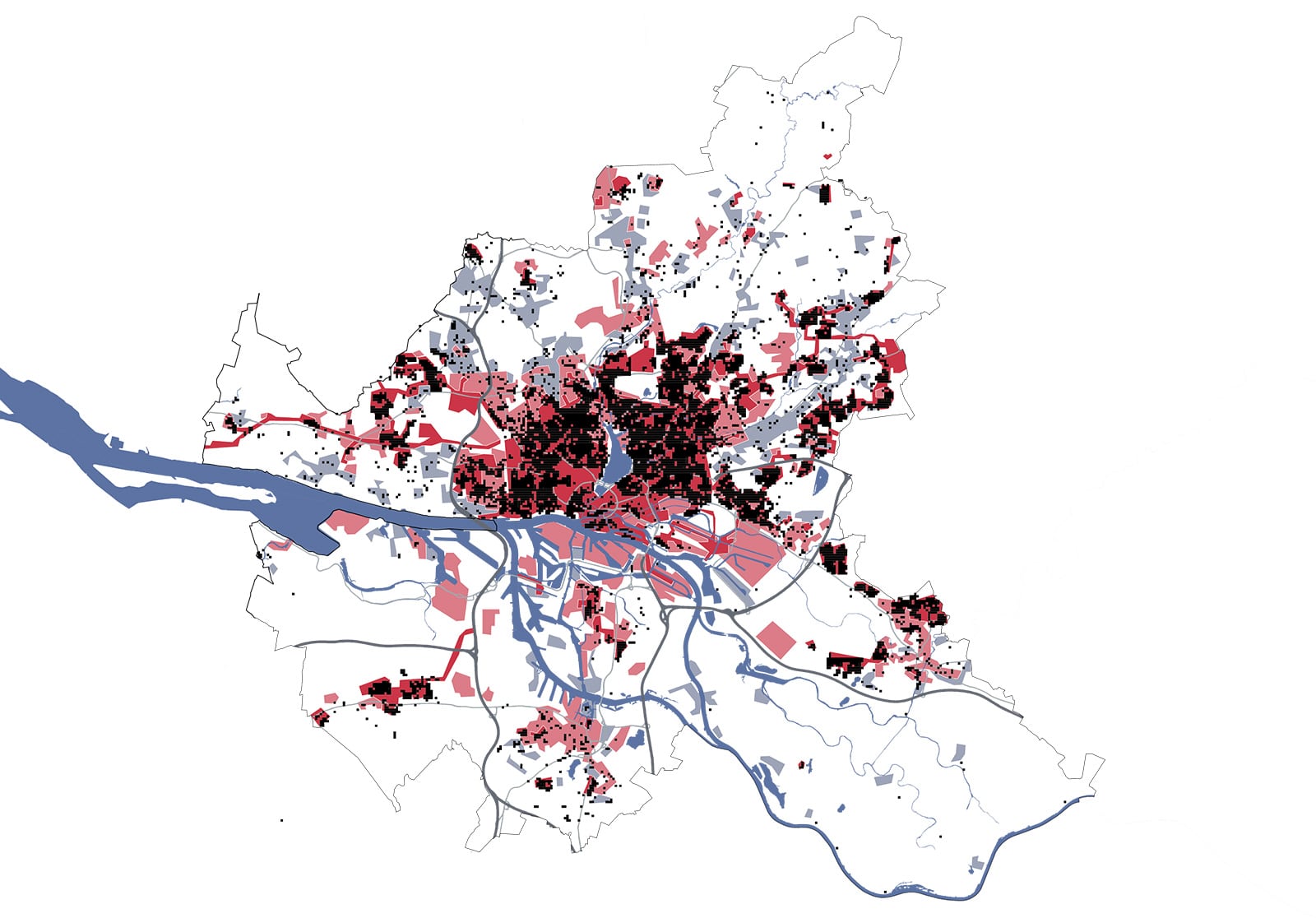 Kartenbeschreibung: Die Karte zeigt die bestehenden und geplanten Fernwärmenetzgebiete in Düsseldorf, Hamburg, München und Stuttgart. Darüber hinaus wurden die bestehenden Fernwärmeanschlüsse anhand des Zensus 2022 ausgewertet. Die schwarzen Quadrate entsprechen einer Fläche von einem Hektar, auf der mindestens fünf Anschlüsse angegeben wurden.