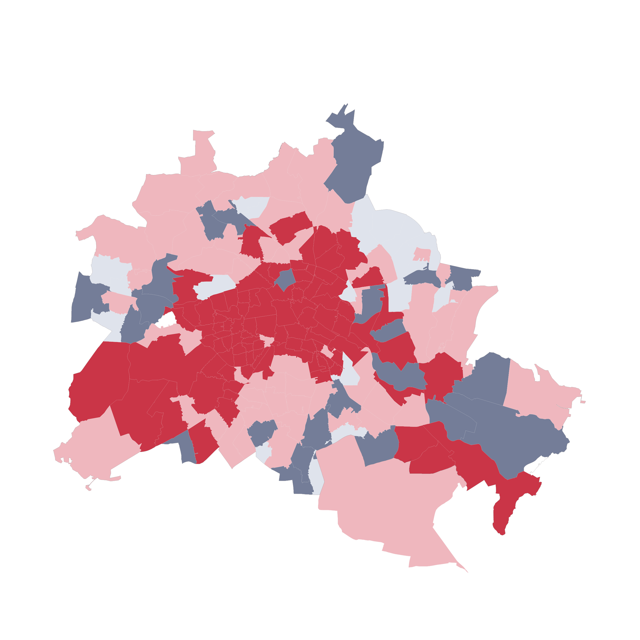 Kartenbeschreibung: Die Karten zeigen für die einzelnen Postleitzahlgebiete die durchschnittliche Mietbelastungsquote bei Neuanmietungen. Die Quote ergibt sich aus den Angebotsmieten im jeweiligen PLZ-Gebiet und dem Haushaltsnettoeinkommen. Um das Haushaltsnettoeinkommen zu berechnen, dient das nach Quantilen differenzierte Bruttoarbeitsentgelt sozialversicherungspflichtig Vollzeitbeschäftigter (Stand 2024) in den jeweiligen Städten als Grundlage. In Berlin liegt das Nettoeinkommen bei Ein-Personenhaushalten des ersten Quantils bei rund 2.040 €/Monat, des Medians bei 2.590 €/Monat und des dritten Quantils bei 3.450 €/Monat. Für DINK-Haushalte (zwei Personen, zwei Einkommen) wird das Bruttoarbeitsentgelt entsprechend verdoppelt. Für Familien wird ein volles und ein halbes Bruttoarbeitsentgelt angesetzt, zusätzlich fließen 500 Euro Kindergeld ins Nettogehalt ein. Als Wohnungsgröße wird die durchschnittliche Wohnungsgröße von 1-Personen-, 2-Personen und 4-Personen-Haushalten aus dem Mikrozensus angesetzt.