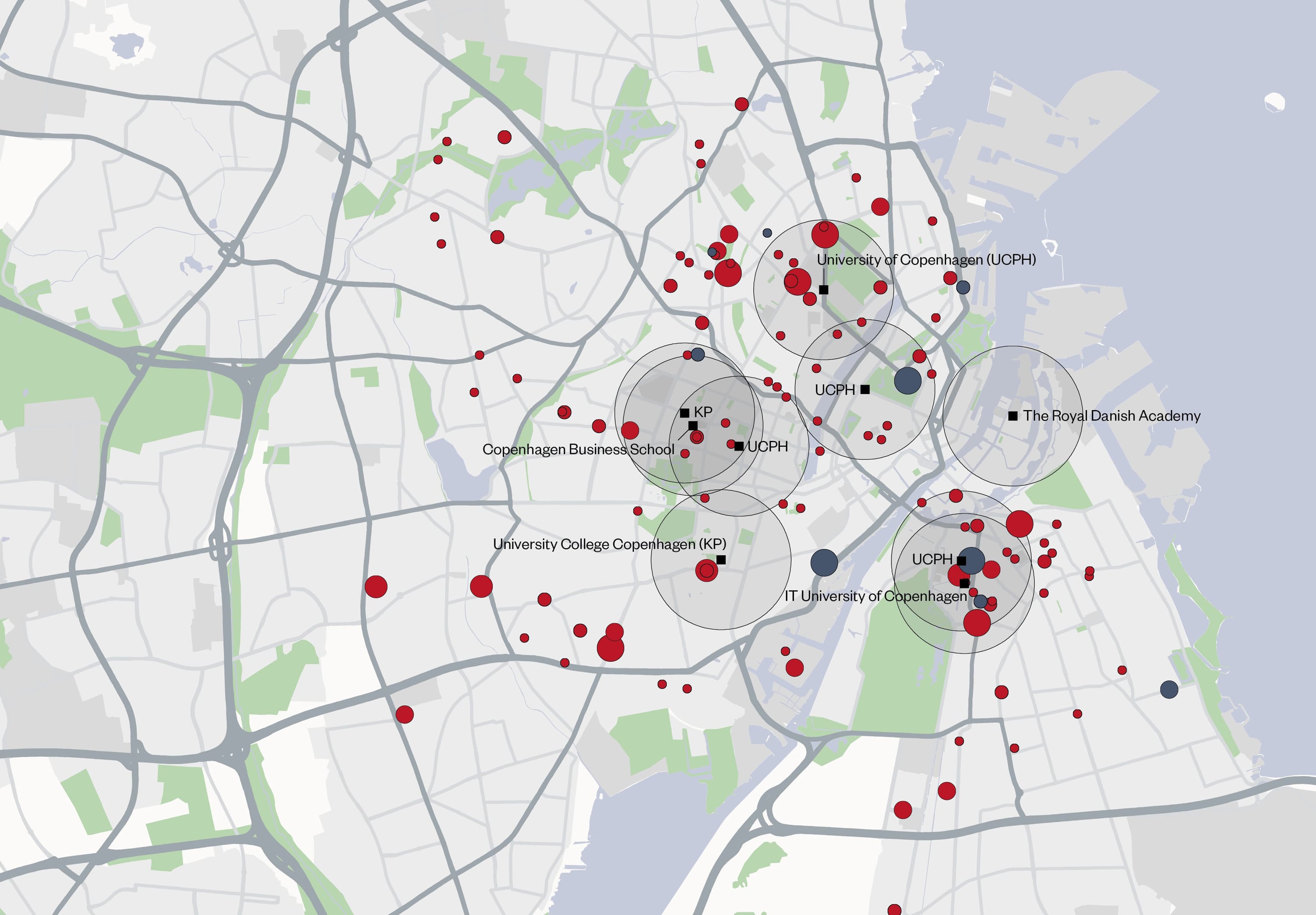 Kartenbeschreibung: In der Karte sind die modernen Wohnungsangebote in Form von Studentenwohnungen und Serviced Apartments sowie die größten Universitäten im zentralen Kopenhagener Stadtteil Indre By verortet. Die Übersichtskarte zeigt den Anteil kleiner Wohnungen (<40 m²) in den einzelnen Kopenhagener Stadtteilen.