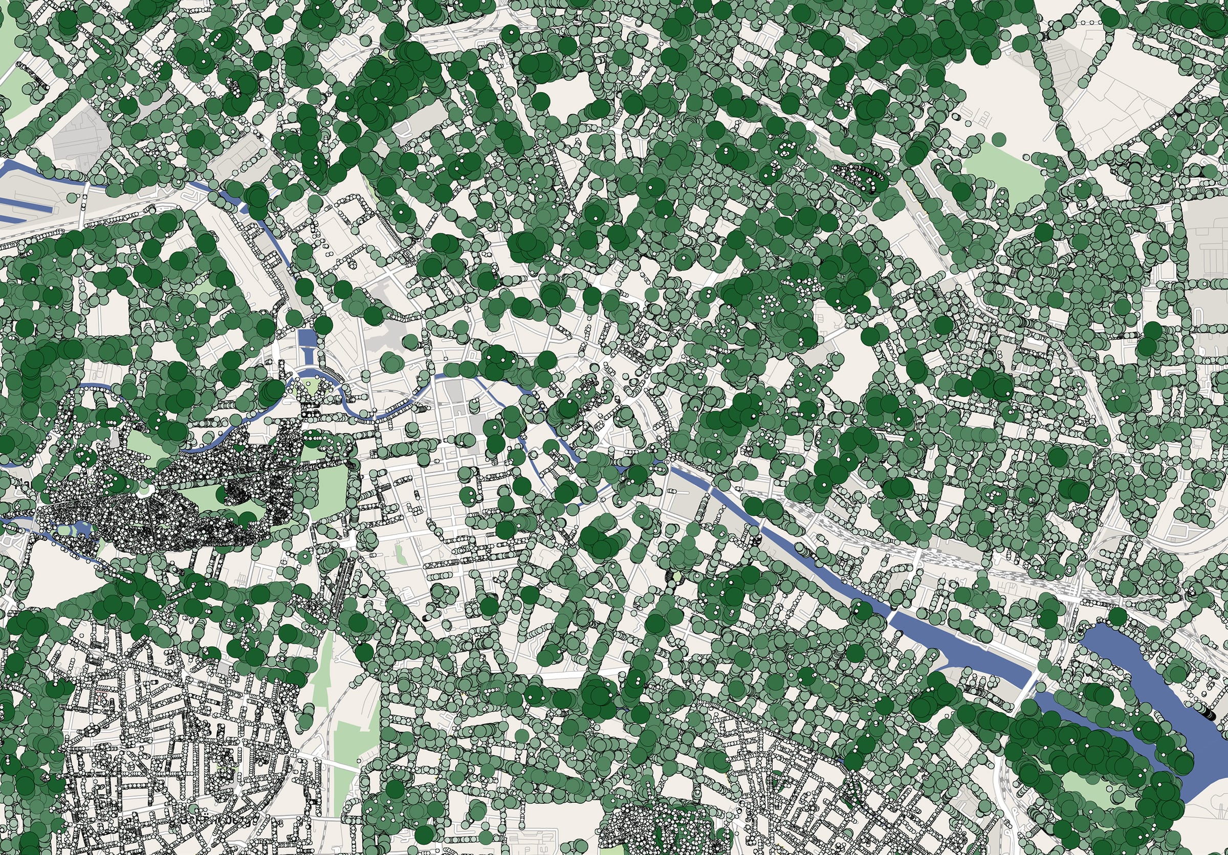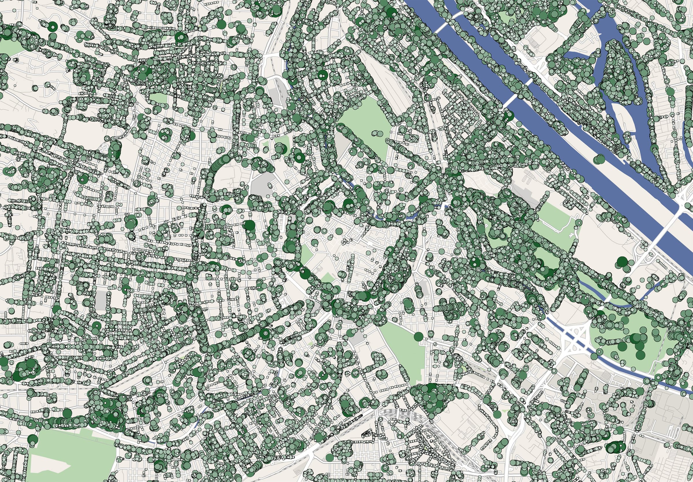 Kartenbeschreibung: Die Karten zeigen die Standorte öffentlicher Bäume mit Kronendurchmesser in Berlin und Wien.
